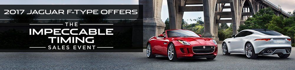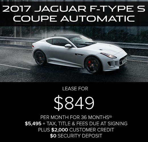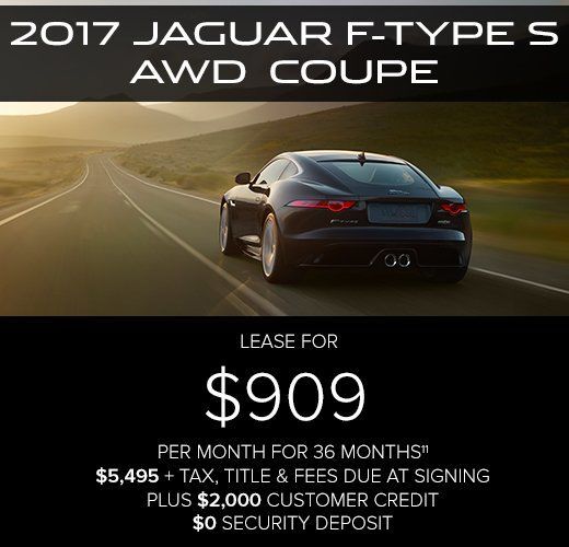 11. 2017 Jaguar F-TYPE S AWD Coupe, 36 month lease, $5,495 due at signing includes $3,791 down, $0 security deposit, $795 acquisition fee and first month's payment, excludes retailer fees, taxes, title and registration fees. Actual rates and payments of closed-end lease may vary. Supplies are limited. Eligible Jaguar Financial Group customers will receive a $2,000 customer credit toward the lease of this vehicle as part of the Jaguar Sales Event offer. Not compatible with other customer credit offers. For well qualified lessees as determined by approved lender. All amounts shown are estimates, retailer sets actual amounts. Lessee responsible for insurance, maintenance, excess wear and excess mileage over 30,000 miles at $0.30/mile. Based on MSRP of $87,595 (includes destination and delivery) with a residual value of $49,053 as of 3/1/17. Residency restrictions apply. Lessee has option to purchase vehicle at lease end at price negotiated with retailer and approved lender at signing. Termination fee may apply. For special lease terms and customer credit offer, take new vehicle delivery from retailer stock by 3/31/17. Jaguar or approved lender may rescind or amend this offer without notice. See your participating Jaguar Retailer for complete details, or call (855) JAGUAR-USA / (855) 524-8278. © 2017 Jaguar Land Rover North America, LLC.