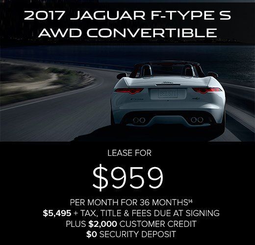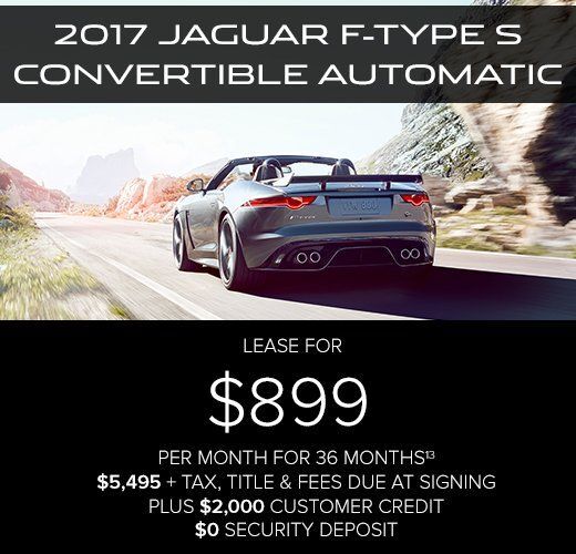 14. 2017 Jaguar F-TYPE S Convertible AWD, 36 month lease, $5,495 due at signing includes $3,741 down, $0 security deposit, $795 acquisition fee and first month's payment, excludes retailer fees, taxes, title and registration fees. Actual rates and payments of closed-end lease may vary. Supplies are limited. Eligible Jaguar Financial Group customers will receive a $2,000 customer credit toward the lease of this vehicle as part of the Jaguar Sales Event offer. Not compatible with other customer credit offers. For well qualified lessees as determined by approved lender. All amounts shown are estimates, retailer sets actual amounts. Lessee responsible for insurance, maintenance, excess wear and excess mileage over 30,000 miles at $0.30/mile. Based on MSRP of $90,695 (includes destination and delivery) with a residual value of $50,789 as of 3/1/17. Residency restrictions apply. Lessee has option to purchase vehicle at lease end at price negotiated with retailer and approved lender at signing. Termination fee may apply. For special lease terms and customer credit offer, take new vehicle delivery from retailer stock by 3/31/17. Jaguar or approved lender may rescind or amend this offer without notice. See your participating Jaguar Retailer for complete details, or call (855) JAGUAR-USA / (855) 524-8278. © 2017 Jaguar Land Rover North America, LLC.