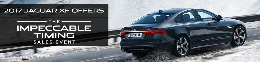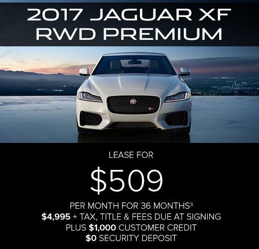 4. 2017 Jaguar XF AWD Premium, 36 month lease, $4,995 due at signing includes $3,671 down, $0 security deposit, $795 acquisition fee and first month's payment, excludes retailer fees, taxes, title and registration fees. Actual rates and payments of closed-end lease may vary. Supplies are limited. Eligible Jaguar Financial Group customers will receive a $1,000 customer credit toward the lease of this vehicle as part of the Jaguar Sales Event offer. Not compatible with other customer credit offers. For well qualified lessees as determined by approved lender. All amounts shown are estimates, retailer sets actual amounts. Lessee responsible for insurance, maintenance, excess wear and excess mileage over 30,000 miles at $0.30/mile. Based on MSRP of $56,595 (includes destination and delivery) with a residual value of $30,561 as of 3/1/17. Residency restrictions apply. Lessee has option to purchase vehicle at lease end at price negotiated with retailer and approved lender at signing. For special lease terms and customer credit offer, take new vehicle delivery from retailer stock by 3/31/17. Termination fee may apply. Jaguar or approved lender may rescind or amend this offer without notice. See your participating Jaguar Retailer for complete details, or call (855) JAGUAR-USA / (855) 524-8278. © 2017 Jaguar Land Rover North America, LLC.