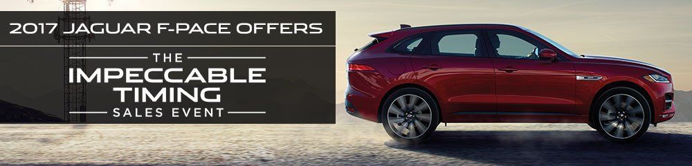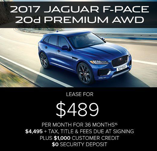 15. 2017 Jaguar F-PACE 20d Premium AWD, 36 month lease, $4,495 due at signing includes $3,211 down, $0 security deposit, $795 acquisition fee and first month's payment, excludes retailer fees, taxes, title and registration fees. Actual rates and payments of closed-end lease may vary. Supplies are limited. Eligible Jaguar Financial Group customers will receive a $1,000 customer credit toward the lease of this vehicle as part of the Jaguar Sales Event offer. Not compatible with other customer credit offers. For well qualified lessees as determined by approved lender. All amounts shown are estimates, retailer sets actual amounts. Lessee responsible for insurance, maintenance, excess wear and excess mileage over 30,000 miles at $0.30/mile. Based on MSRP of $46,195 (includes destination and delivery) with a residual value of $25,407 as of 3/1/17. Residency restrictions apply. Lessee has option to purchase vehicle at lease end at price negotiated with retailer and approved lender at signing. Termination fee may apply. For special lease terms and customer credit offer, take new vehicle delivery from retailer stock by 3/31/17. Jaguar or approved lender may rescind or amend this offer without notice. See your participating Jaguar Retailer for complete details, or call (855) JAGUAR-USA / (855) 524-8278. © 2017 Jaguar Land Rover North America, LLC.