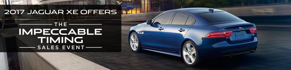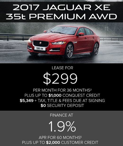 2. 2017 Jaguar XE 35t Premium AWD with 36 month lease, $5,349 due at signing includes $4,255 down, $0 security deposit, $795 acquisition fee and first month's payment, excludes retailer fees, taxes, title and registration fees. $1,000 "Impeccable Timing" Sales Event credit included in the lease payment is a credit against the lease of the subject vehicle for qualified JFG customers. Actual rates and payments of closed-end lease may vary. Supplies are limited. Eligible customers may qualify for an additional $1000 Conquest Credit. Customers must present proof of current competitive vehicle ownership. For well qualified lessees as determined by approved lender. All amounts shown are estimates, retailer sets actual amounts. Lessee responsible for insurance, maintenance, excess wear and excess mileage over 30,000 miles at $0.30/mile. Based on MSRP of $45,195 (includes destination and delivery) with a residual value of $28,021 as of 3/1/17. Residency restrictions apply. Lessee has option to purchase vehicle at lease end at price negotiated with retailer and approved lender at signing. For special lease terms and customer credit offer, take new vehicle delivery from retailer stock by 3/31/17. Termination fee may apply. Jaguar or approved lender may rescind or amend this offer without notice. See your participating Jaguar Retailer for complete details, or call (855) JAGUAR-USA / (855) 524-8278. © 2017 Jaguar Land Rover North America, LLC.