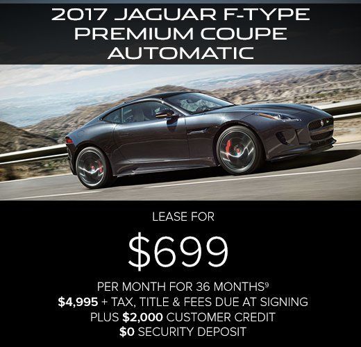 9. 2017 Jaguar F-TYPE Premium Coupe Automatic, 36 month lease, $4,995 due at signing includes $3,501 down, $0 security deposit, $795 acquisition fee and first month's payment, excludes retailer fees, taxes, title and registration fees. Actual rates and payments of closed-end lease may vary. Supplies are limited. Eligible Jaguar Financial Group customers will receive a $2,000 customer credit toward the lease of this vehicle as part of the Jaguar Sales Event offer. Not compatible with other customer credit offers. For well qualified lessees as determined by approved lender. All amounts shown are estimates, retailer sets actual amounts. Lessee responsible for insurance, maintenance, excess wear and excess mileage over 30,000 miles at $0.30/mile. Based on MSRP of $69,095 (includes destination and delivery) with a residual value of $42,839 as of 3/1/7. Residency restrictions apply. Lessee has option to purchase vehicle at lease end at price negotiated with retailer and approved lender at signing. Termination fee may apply. For special lease terms and customer credit offer, take new vehicle delivery from retailer stock by 3/31/17. Jaguar or approved lender may rescind or amend this offer without notice. See your participating Jaguar Retailer for complete details, or call (855) JAGUAR-USA / (855) 524-8278. © 2017 Jaguar Land Rover North America, LLC.