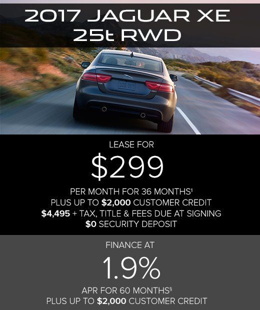 1. 2017 Jaguar XE 25t RWD with 36 month lease, $4,495 due at signing includes $3,401 down, $0 security deposit, $795 acquisition fee and first month's payment, excludes retailer fees, taxes, title and registration fees. Actual rates and payments of closed-end lease may vary. Supplies are limited. Eligible Jaguar Financial Group customers will receive a $1,000 customer credit toward the lease of this vehicle as part of the Jaguar Sales Event offer. Eligible customers may qualify for an additional $1000 Conquest Credit. Customers must present proof of current competitive vehicle ownership. For well qualified lessees as determined by approved lender. All amounts shown are estimates, retailer sets actual amounts. Lessee responsible for insurance, maintenance, excess wear and excess mileage over 30,000 miles at $0.30/mile. Based on MSRP of $35,895 (includes destination and delivery) with a residual value of $21,178 as of 3/1/17. Residency restrictions apply. Lessee has option to purchase vehicle at lease end at price negotiated with retailer and approved lender at signing. For special lease terms and customer credit offer, take new vehicle delivery from retailer stock by 3/31/17. Termination fee may apply. Jaguar or approved lender may rescind or amend this offer without notice. See your participating Jaguar Retailer for complete details, or call (855) JAGUAR-USA / (855) 524-8278. © 2017 Jaguar Land Rover North America, LLC.