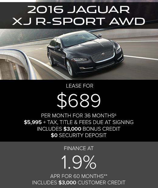 6. 2016 Jaguar XJ R-Sport AWD, 36 month lease, $5,995 due at signing includes $4,512 down, $0 security deposit, $795 acquisition fee and first month's payment, excludes retailer fees, taxes, title and registration fees. Actual rates and payments of closed-end lease may vary. Supplies are limited. Eligible Jaguar Financial Group customers will receive a $3,000 customer credit toward the lease of this vehicle as part of the Jaguar Sales Event offer. $3,000 customer credit included in lease payments is a credit against the lease of the subject vehicle. Not compatible with other customer credit offers. For well qualified lessees as determined by approved lender. All amounts shown are estimates, retailer sets actual amounts. Lessee responsible for insurance, maintenance, excess wear and excess mileage over 30,000 miles at $0.30/mile. Based on MSRP of $78,895 (includes destination and delivery) with a residual value of $38,659 as of 3/1/17. Residency restrictions apply. Lessee has option to purchase vehicle at lease end at price negotiated with retailer and approved lender at signing. Termination fee may apply. For special lease terms and customer credit offer, take new vehicle delivery from retailer stock by 3/31/17. Jaguar or approved lender may rescind or amend this offer without notice. See your participating Jaguar Retailer for complete details, or call (855) JAGUAR-USA / (855) 524-8278. © 2017 Jaguar Land Rover North America, LLC.