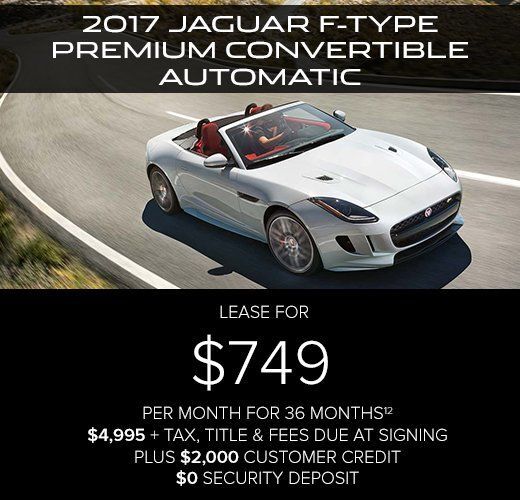 12. 2017 Jaguar F-TYPE Premium Convertible Automatic, 36 month lease, $4,995 due at signing includes $3,451 down, $0 security deposit, $795 acquisition fee and first month's payment, excludes retailer fees, taxes, title and registration fees. Actual rates and payments of closed-end lease may vary. Supplies are limited. Eligible Jaguar Financial Group customers will receive a $2,000 customer credit toward the lease of this vehicle as part of the Jaguar Sales Event offer. Not compatible with other customer credit offers. For well qualified lessees as determined by approved lender. All amounts shown are estimates, retailer sets actual amounts. Lessee responsible for insurance, maintenance, excess wear and excess mileage over 30,000 miles at $0.30/mile. Based on MSRP of $72,195 (includes destination and delivery) with a residual value of $44,039 as of 3/1/17. Residency restrictions apply. Lessee has option to purchase vehicle at lease end at price negotiated with retailer and approved lender at signing. Termination fee may apply. For special lease terms and customer credit offer, take new vehicle delivery from retailer stock by 3/31/17. See your participating Jaguar Retailer for complete details, or call (855) JAGUAR-USA / (855) 524-8278. © 2017 Jaguar Land Rover North America, LLC.
