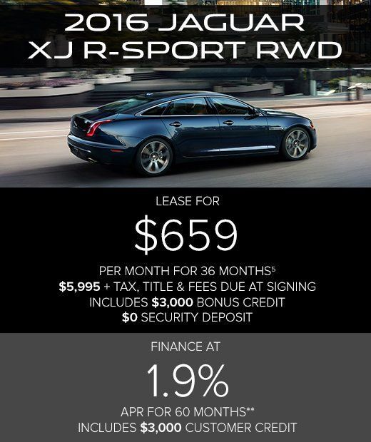 5. 2016 Jaguar XJ R-Sport, 36 month lease, $5,995 due at signing includes $4,541 down, $0 security deposit, $795 acquisition fee and first month's payment, excludes retailer fees, taxes, title and registration fees. Actual rates and payments of closed-end lease may vary. Supplies are limited. Eligible Jaguar Financial Group customers will receive a $3,000 customer credit toward the lease of this vehicle as part of the Jaguar Sales Event offer. $3,000 customer credit included in lease payments is a credit against the lease of the subject vehicle. Not compatible with other customer credit offers. For well qualified lessees as determined by approved lender. All amounts shown are estimates, retailer sets actual amounts. Lessee responsible for insurance, maintenance, excess wear and excess mileage over 30,000 miles at $0.30/mile. Based on MSRP of $75,395 (includes destination and delivery) with a residual value of $36,944 as of 3/1/17. Residency restrictions apply. Lessee has option to purchase vehicle at lease end at price negotiated with retailer and approved lender at signing. Termination fee may apply. For special lease terms and customer credit offer, take new vehicle delivery from retailer stock by 03/31/17. Jaguar or approved lender may rescind or amend this offer without notice. See your participating Jaguar Retailer for complete details, or call (855) JAGUAR-USA / (855) 524-8278. © 2017 Jaguar Land Rover North America, LLC.